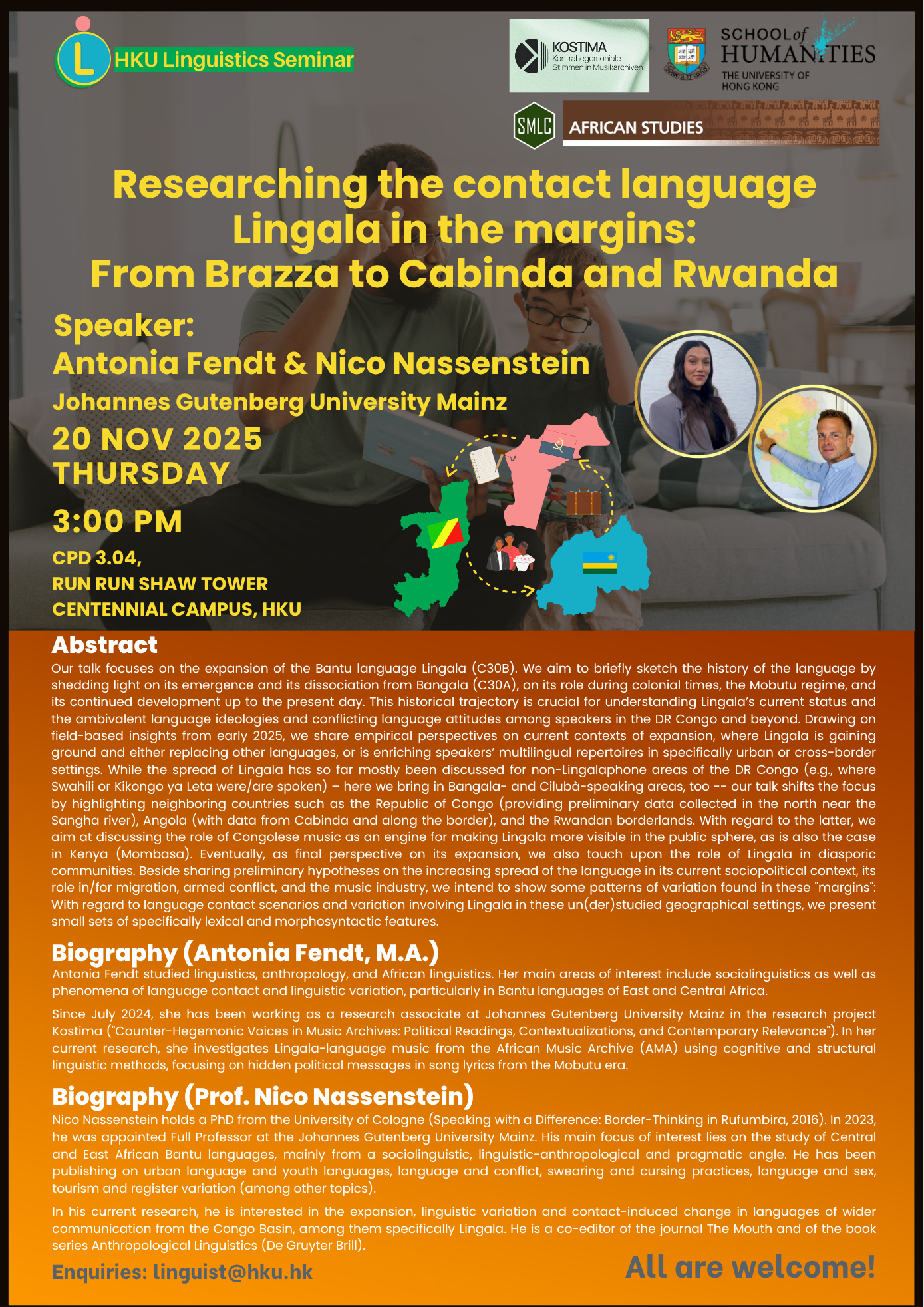 [Linguistics Seminar on 20 Nov] Researching the contact language Lingala in the margins: From Brazza to Cabinda and Rwanda Researching the contact language Lingala in the margins: From Brazza to Cabinda and Rwanda Date: 20 Nov 2025 (Thu) Time: 4:00 pm Venue: Rm 3.04, 3/F Run Run Shaw Tower, Centennial Campus, HKU Steven Chan2025-12-06T12:36:47+08:00 Share This Event! FacebookXLinkedInPinterestEmail